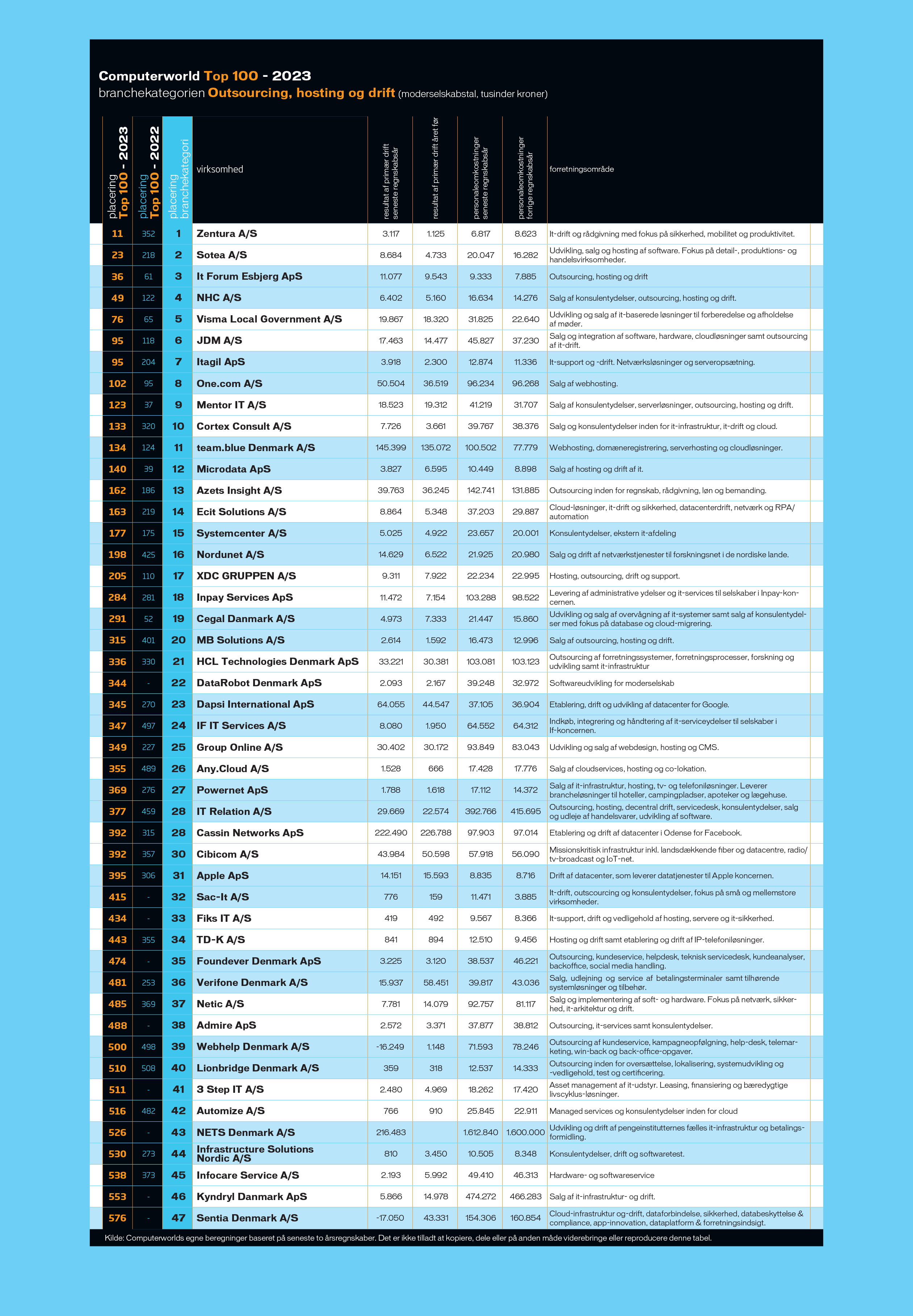 Den højest placerede virksomhed i kategorien er det Taastrup-baserede Zentura, som tager en 11.-plads på den samlede Top 100-liste, men altså en førsteplads i kategorien.